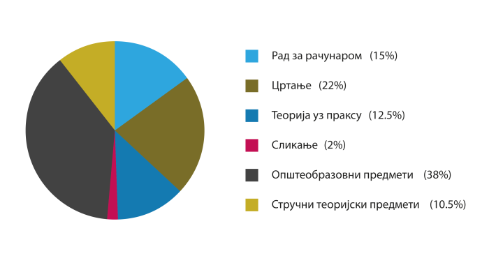 Ученици на овом образовном профилу се баве интензивно цртањем и сликањем у разним облицима (цртање мртве природе, портрета, људске фигуре, илустрације…). Поред тога, обучавају се за израду различитих графичких производа, од израде скице, преко разраде и израде прототипа на папиру, који затим израђују дигитално употребом програма из Adobe пакета (првенствено Photoshop и Illustrator). У процесу израде графичког производа обучавају се у свим аспектима употребе и израде типографије, илустрације и осталих елемената графичког дизајна. Почињу са једноставнијим задацима као што је израда налепница, етикета, па се интензивије баве израдом визуелног идентитета, плаката, корица за часописе, књиге и на крају, дизајном амбалаже.